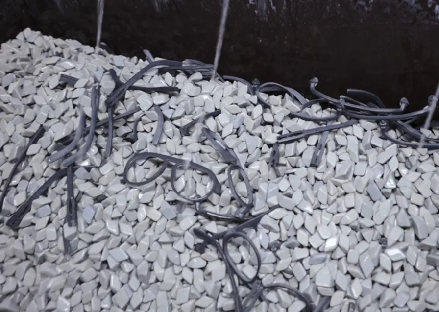 A post-process tumbling operation used to smooth the surface finish of 3D printed eyeglass frames.