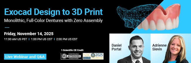 In this dental 3D printing webinar, you’ll learn how to create stunning, functional dentures that require zero assembly after printing. You’ll master the complete exocad denture design workflow for monolithic full-color dentures that deliver exceptional aesthetics and optimal performance.